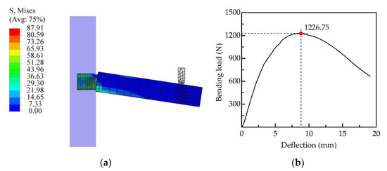 Another M–T joint T-shaped finite element model was established using the optimized tenon size, measuring 28.81 mm long by 25 mm thick. Figure 7 shows the results of the finite element model, indicating that the maximum bending load is 1226.75 N (Figure 7b). According to Equation (4), the BMC of optimized M–T joints is 159.48 Nm, which is well consistent with the result of the response surface model (160.18 Nm) and higher than other combinations of tenon widths and tenon lengths evaluated in this study. Therefore, the method of combining FEM and the response surface method is capable of optimizing the BMC of M–T joint T-shaped samples.