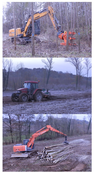 Small tree size represents a major challenge when harvesting young plantations. The productivity of forest equipment declines very rapidly when tree size is smaller than optimum [11,12], and even thinning machines are designed for trees with an optimum size around 0.2 m3. When the average tree size is much smaller than that—as in the case of 5–8 year old poplars—then it is best to opt for mass handling, harvesting more trees in one single cycle to offset small individual tree volume [13]. Several multi-tree harvesting machines have been developed for early thinning operations and are commercially available on the European market, under the categories of “feller-buncher” and “multi-stem harvester”—respectively designed for whole tree (WT) and cut-to-length (CTL) harvesting [14]. Between the two, feller-bunchers are simpler and cheaper, and represent the initial step of a harvesting system whereby trees are felled and bunched, and then extracted whole to a landing for processing into commercial assortments [15]. This harvesting method has the advantage of simplified in-forest handling [16] while remaining flexible enough to produce either whole-tree chips or a combination of logs and chips [17]. What is most important, this method guarantees mass handling all along the chain, as trees are bunched at the same time as they are felled and they are never separated again—all trees in the same bunch being crosscut together in a single pass when they reach the landing. A further advantage of this method is that it can be implemented through simple and inexpensive machinery, which makes it especially attractive to small operators with limited capital availability. Fully mechanized WT harvesting can be deployed using adapted general-purpose machinery and still achieve a very high productivity.