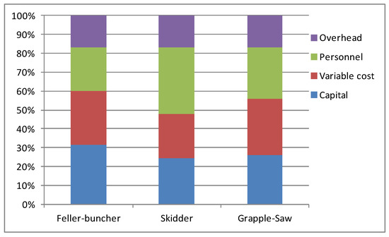 Machine cost was estimated using the European harmonized forest machine costing method recently published within the scope of COST Action FP0902 [21]. Costing assumptions were obtained from Pellerei Ago Srl. Therefore, calculated costs reflected actual machine rates and were 69 € h−1 for the excavator-based feller-buncher, 45 € h−1 for the skidder and 58 € h−1 for the grapple saw unit (Table 1). Figure 2 demonstrates that all tested technology was indeed low capital, since capital cost represented between 25% and 30% of the total cost (Figure 2).