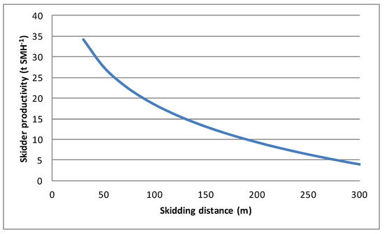 However, skidding productivity proved extremely sensitive to skidding distance, as cycle time would rapidly grow as distance increased (Table 3—Equation (5)). That is why two tractors were made available on site, with the second tractor ready to step in when needed; that way, the grapple-saw could be kept fed even when harvesting the most distant blocks, placed 300 m away. Regression analysis showed that skidder productivity decreased with the natural logarithm of skidding distance —hence, very quickly (Table 3—Equation (6)). This is clearly shown in Figure 3.
