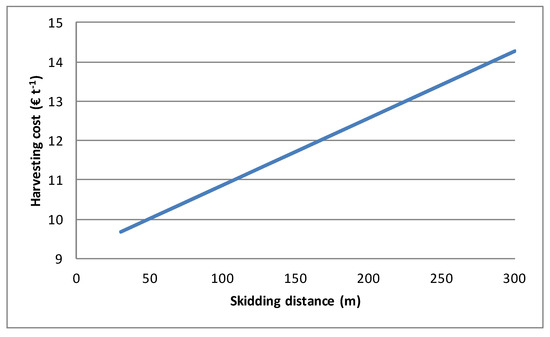 Harvesting cost most commonly ranged between 8.5 and 13.7 € t−1 (interquartile range), with the average at 11.1 € t−1 (Table 2). The effect of increasing extraction distance reverberated through the whole chain and determined a significant increase of overall harvesting cost (Table 3—Equation (7), Figure 4). However, the cost increase was lower than the theoretical value calculated simply by adding a mean felling and processing cost to the steeply growing skidding cost curve: that pointed at a certain capacity for the system to readjust and absorb part of the eventual inefficiency caused by an extension of skidding distance (Figure 4). No significant relationship was found between harvesting cost, tree size and field stocking, which is evidence for the capacity of mass handling to offset variations of tree size and field stocking—at least within the limits explored in this study.