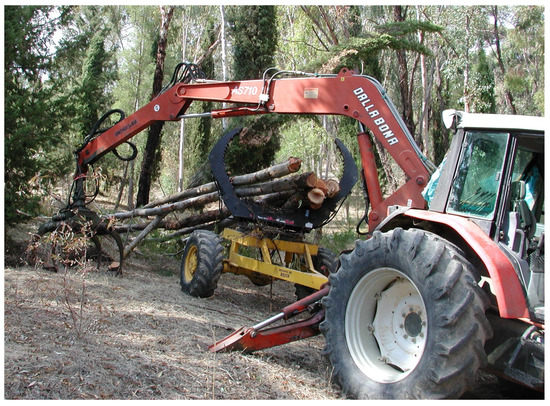 Furthermore, much attention should be devoted to skidding, which is the most sensitive to extraction distance. The study shows that skidding cost is low and system balance is achieved when the extraction distance is around 100 m; beyond that distance, productivity drops and skidding cost increases sharply. What is most important, the operation designed and tested in this study is a ∜hot deck∝ system [28] where all components are closely interdependent; therefore, if the productivity of one component decreases, so does that of the components downstream (i.e., starvation) and upstream (i.e. constipation), which is bound to generate a multiplier effect. That is why a second tractor was kept at hand, for deploying when extraction distance became excessively long. As a norm, a second tractor should be deployed when the extraction distance exceeds 150 m, so that system balance can be maintained. However, that will double skidding cost. The reason why tractor-based skidders are so sensitive to extraction distance is in their limited payload capacity. While modified farm tractors can achieve a field speed in excess of 15 km h−1 (with recorded peaks above 20 km h−1), their payload seldom exceeds 1 t. In fact, loading trees on a trailer would allow a marked increase of payload, but preliminary tests showed that such operation would result in excessive stem breakage, which occurred when lifting the stems from their mid-point and placing them on the trailer. A better solution is likely found with a clambunk skidder, which has a much larger payload capacity than a conventional skidder but still grabs the trees from their butt ends and does not require full lifting from the midpoint [29]. The main technical drawback of clambunk skidders is their limited maneuverability [30], which probably is not a great handicap when clearcutting a plantation in flat and even terrain. If capital cost must be minimized and versatility enhanced, then one may resort to a clambunk attachment for farm tractors, which can be built locally (Figure 5).