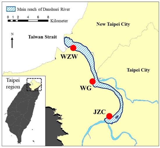 This study was conducted at three sites, including Waziwei (WZW) (25°09′ N, 121°25′ E), Wugu (WG) (25°06′ N, 121°27′ E) and Jiangzicui (JZC) (25°02′ N, 121°29′ E), located longitudinally along the 23.7 km-long, tidally influenced Danshuei Riverine Mangrove, situated at the downstream end of the Danshuei River (Figure 1). The Danshuei River is the largest river in northern Taiwan; it is highly urbanized, with a population of seven million. It drains 2726 km2 of watershed area, and the water quality is generally polluted, primarily due to industrial and municipal discharges. With the rapid economic development of Taipei in recent decades, the increasing metallic pollution in Danshuei River, due to treated and untreated sewage, and various non-point source discharges, has become a matter of public concern []. The tidally influenced downstream estuary of the Danshuei River is lined by the extensive growth of mangrove plants, i.e., Kandelia obovata Sheue, Liu and Young (Rhizophoraceae), which form the Danshuei Riverine Mangrove. Regular water quality monitoring for metallic pollution in the Danshuei River has been carried out since the early 1990s, but a systematic sediment assessment of the river environment in Taiwan did not begin until 2014. Moreover, biomonitoring of the impact of sediment metallic pollution is not currently carried out in the ongoing government monitoring programs []. Such a paucity of long-term baseline knowledge about the metallic contamination of biota has resulted in difficulties regarding our understanding of the pollution risk to the mangrove ecosystem.