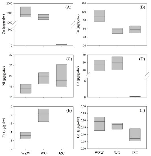 Boxplots showing the mean metallic burdens of (A) Zn, (B) Cu, (C) Ni, (D) Cr, (E) Pb, (F) Cd for the bivalves in the three study sites, i.e., WZW, WG and JZC, along Danshuei Riverine Mangrove.