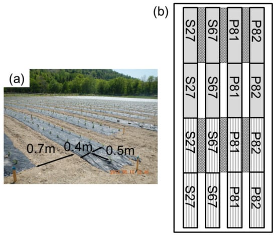 Experimental design: (a) double row planting of 20 cm long cuttings through mulch films, (b) layout of cutback and weed control treatments of two clones of Salix sachalinensis (S27, S67) and S. pet-susu (P81, P82) within a block. Vertical lines represent cutback and grey columns represent non-cutback treatments. White areas between the mulched areas represent weed-control treatments and black cross-hatching represent non-weed-control treatments, respectively.