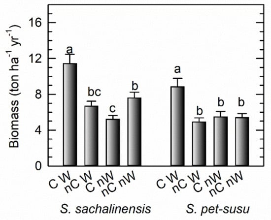 S. sachalinensis, which had relatively higher growth reduction in the cutback and no weeding treatment compared to S. pet-susu, exhibited higher biomass production under optimum conditions (complete weed control). Similar results were reported previously for 10 commercial breeding clones in southern Sweden [8]. The relatively low biomass production even without weed competition may partly explain the low growth reduction with weed competition. In this respect, commercial breeding has been mainly aimed at the goal of high biomass production, and this is mostly considered under optimum environmental conditions. Willow species with high biomass productivity may have high nutrient demands and, thus, their productivity may decrease when exposed to competition from weeds. Therefore, further studies on physiological traits, such as nutrient and water acquisition and their use efficiency, canopy structure and development, and biomass allocation between aboveground organs and roots of different species and clones, are critical for the effective management of SRC plantations [22,25,36,37]. All these factors can be manipulated through genetic improvement and silvicultural practice [38].