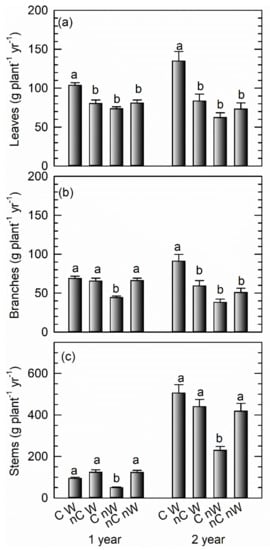 Annual biomass increments of (a) leaves, (b) branches, and (c) stems of Salix sachalinensis in the first and second growing seasons after cutback. C and nC represent with and without cutback; W and nW represent with and without weed control, respectively. The significance values of the factorial analysis are shown in Table S2. Different letters indicate significant differences in the corresponding values in a single year at p < 0.05. Values shown are mean ± SE from two clones of the same species.