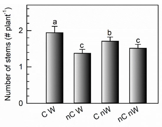 Number of stems sprouting from a single stool, counted after one season of growth since cutback in Salix sachalinensis. C and nC represent with and without cutback; W and nW represent with and without weed control, respectively. The significance values of the factorial analysis are shown in Table S1. Different letters indicate significant differences in the corresponding values at p < 0.05. Values shown are mean ± SE from two clones of the same species.