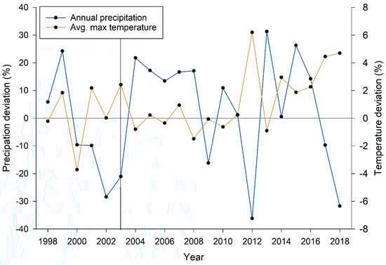 Precipitation (left axis) and temperature (right axis) percent deviation (deviation from long-term mean 1950 to 2018) spanning from 1998 to 2018 from Vallecito dam (https://wrcc.dri.edu/cgi-bin/cliMAIN.pl?co8582) near Pagosa, Colorado, USA. The vertical line represents pretreatment sampling.