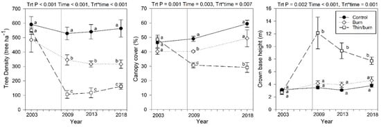 Forest structure (trees taller than 137 cm and >2.5 cm dbh) through time for both treatments and control. Bars represent 1 standard error of the mean (n = 4). The vertical line denotes when all treatments were completed (2008). Data comparisons are among treatments and different letters denote a significant treatment effect within a year (p ≤ 0.05).