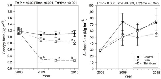 Mean canopy fuels (crown fuel load) and surface fuels (sum of forest floor and 1–100-h time lag classes) plotted through time for both treatments and control. Bars represent 1 standard error of the mean (n = 4). The vertical line denotes when all treatments were completed (2008). Data comparisons are among treatments and different letters denote a significant treatment effect within a year (p ≤ 0.05).