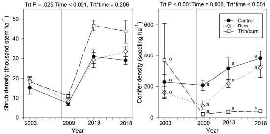 Mean shrub and conifer seedling density (>40 cm and ≤ 137 cm in height) plotted through time for both treatments and control. Bars represent 1 standard error of the mean (n = 4). The vertical line denotes when all treatments were completed (2008). Data comparisons are among treatments and different letters denote a significant treatment effect within a year (p ≤ 0.05).