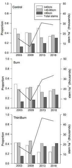 The shrub midstory consists of vegetation 50 cm–8 m in height (Short 1986). Shrubs and conifer seedling densities responded strongly to inter-annual climatic differences, but there were significant treatment effects for shrub and conifer seedling densities, as well as a significant treatment × time interaction for conifer seedlings (Figure 5). By 2018, 10 years post-treatment, shrub densities in thin/burn were on average 24% and 34% greater than the control and burn, respectively. Over the 15-year study period (2003–2018), mean shrub densities increased by 86%, 76%, and 144%, respectively, in the control, burn, and thin/burn treatments (Figure 5). Furthermore, the size classes’ distribution shifted toward taller shrubs, being especially pronounced in the thin/burn treatment (Figure 6). For example, in 2003, prior to treatments, the proportion of shrubs >80 cm in height was <14% across all treatments and by 2018 this proportion increased to 30%, 27%, and 41%, respectively, in the control, burn, and thin/burn treatments. A. alnifolia, Q. gambelii, and S. rotundifolius were the dominant species driving the total shrub density increases between 2003 and 2018 (Table 2).