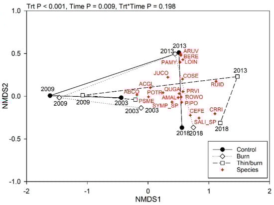 Non-metric multidimensional scaling (NMS) ordination of the midstory plant community (shrubs and conifer regeneration (>40 cm and ≤ 137 cm in height)). Each symbol represents a treatment within a sampling year. The final solution had 2 dimensions and represented >90% of the variation of the Bray–Curtis distance matrix (stress 9.4, p = 0.0001). PERMANOVA results are presented above the graph (p ≤0.05). ACGL = Acer glabrum, AMAL = Amelanchier alnifolia, ARUV = Arctostaphylos uva-ursi, BERE = Berberis repens, CEFE = Ceanothus fendleri, COSE = Cornus sericea, JUCO = Juniperus communis, LOIN = Lonicera involucrata, PAMY = Paxistima myrsinites, PRVI = Prunus virginiana, QUGA = Quercus gambelii, ROWO = Rosa woodsii, RUID = Rubus idaeus, SALI_SP = Salix sp, SYRO = Symphoricarpos rotundifolius ABCO = Abies concolor, PIPO = Pinus ponderosa, POTR = Populus tremuloides, PSME = Pseudotsuga menziesii.