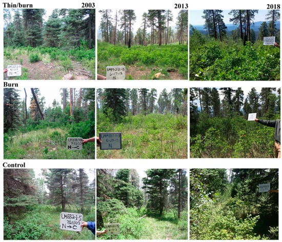 Despite the widespread use of forest restoration treatments in dry forest types across the western U.S. for the past few decades, questions remain regarding treatment effects on ecosystem dynamics due to the scarcity of long-term (≥10 years) multi-scaled studies [15]. For example, increasing native plant diversity is one of the most cited goals for ecological restoration [16], but presently, there is a dearth of research on how treatments affect understory plant communities over the long term [17,18,19,20,21,22]. In a meta-analysis, Schwilk et al. [23] found no consistent pattern in understory community diversity and abundance in response to forest restoration treatments. However, Abella and Springer [20] found that understory abundance consistently increased in studies that monitored changes for five years or longer. On sites where sprouting woody species are abundant in the understory or midstory, rapid increases following tree thinning and fire may inhibit the establishment and growth of other less competitive species [11]. These patterns may in turn affect ecosystem dynamics, particularly with subsequent severe fire [24]. Further, the effects of shrub responses on the treatment longevity and when follow-up treatments are necessary remains unclear for land managers [11,25,26,27]. Pretreatment stand conditions, treatment intensity, and site productivity all affect the longevity of restoration treatment effectiveness [28].