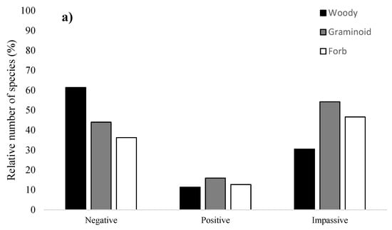 Plant life form schemes are widely accepted functional groups (first conceived by the authors of []). A plant life form is defined as the structural form of a plant in its typical or preferred habitat. The simplest life form classification separates woody and herbaceous species. Other more complex classifications have developed within these two categories and are well known [,,]. Despite these being very broad groups, species within each life form bear enough similarities when dealing with broad or general questions on community structure. For instance, life span separates long-lived woody species from more frequently annual herbaceous species, and it allows for the generalization of, for instance, community turnover. Additionally, stature and associated plant height separate tall woody species from shorter graminoid and forb species, resulting in clear differences in resource acquisition between life forms. Propagation, seasonal growth habits, and protective structures are other characteristics that separate those life forms that allow for the generalization of the community processes based on them. To balance between generalization and detail, sub categories are distinguished (e.g., trees, shrubs, sedges, grasses, legumes, clonal and non-clonal forbs).