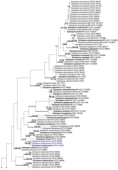 Based on the multilocus phylogeny and morphology, all three strains were assigned to one new species, named Cytospora haidianensis, representing a monophyletic clade with high support value (MP/ML/BI = 100/100/1).