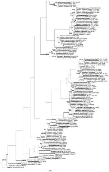 In the past, it was difficult to name Cytospora species because of their morphological overlap, causing confusion in species delimitation. Previously, identification of Cytospora species was mainly based on host affiliations, often with unclear morphological descriptions. Since the advent of molecular analysis, morphology and phylogeny using internal transcribed spacer (ITS) sequence data were combined to describe 28 species of Cytospora from Eucalyptus, of which 11 species were new to science [5]. Later, similar methods were used to describe 14 species from South Africa [6]. However, only ITS sequences are available for most known Cytospora species, ex-type sequence data are available for only a few species and many taxa need epitypification. Thus, recent studies have subsequently emphasized only part of Cytospora species using a polyphasic approach to solve the confusion in species recognition [3,4,7,8].