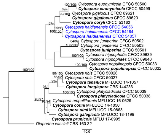 Phylogram of the best-parsimonious tree of Cytospora based on combined ACT, ITS, RPB2, TEF1-α and TUB2 genes. MP and ML bootstrap support values above 70% are shown at the first and second positions, respectively. Thickened branches represent posterior probabilities from BI above 0.95. Scale bar = 40 nucleotide substitutions. Diaporthe vaccinii CBS 160.32 was used as the outgroup. Ex-type strains are in bold. Strains from the current study are in bold and blue.