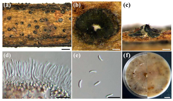 Cytospora haidianensis (CF 20198643). (a) Habitat of conidiomata on stems and branches of Euonymus alatus. (b) Transverse section of conidioma. (c) Longitudinal section through conidioma. (d) Conidiophores and conidiogenous cells. (e) Conidia. (f) Top (left) and bottom (right) sides of colonies on potato dextrose agar (PDA) after 30 days. Scale bars: a: 1 mm; b: 100 µm; c: 200 µm; d,e: 10 µm; f: 1 cm.