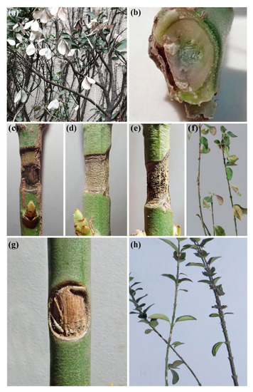 Stem blight symptoms on Euonymus alatus caused by Cytospora haidianensis. (a) Death of the whole plant caused by C. haidianensis on University Road, Beijing, China. (b) Stem blight caused by C. haidianensis in the greenhouse. Symptoms after (c) one week, (d) two weeks and (e) three weeks after inoculation of C. haidianensis. (f) Symptoms on Euonymus alatus twigs three weeks after inoculation of Cytospora haidianensis. (g,h) No symptoms on Euonymus alatus twigs after three weeks of inoculation with agar block (control).