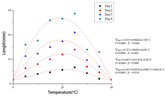 Regression curves and equations for mycelial growth of Cytospora haidianensis after incubation for 24, 48, 72 and 96 h at 0, 5, 10, 15, 20, 25, 30, 35 and 40 °C on PDA medium (X = temperature (°C), Y = growth (colony diameter, mm)). Optimal mycelial growth temperature was estimated to be 19.8 °C.
