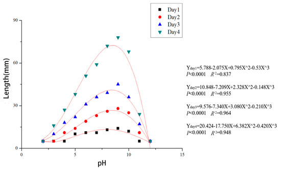 Regression curves and equations for mycelial growth of Cytospora haidianensis after incubation for 24, 48, 72 and 96 h at pH 2.0, 3.0, 4.0, 5.0, 6.0, 7.0, 8.0, 9.0, 10.0, 11.0 and 12.0 on PDA medium (X = pH, Y = growth (colony diameter, mm)). Optimum mycelial growth was estimated to be at pH 8.3.