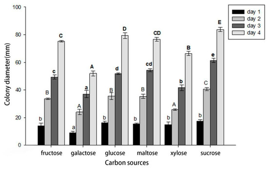 Effects of carbon source on growth of Cytospora haidianensis. Bars with uppercase or lowercase letters represent significant differences after, respectively, 24, 48, 72 and 96 h incubation, according to HSD tests at the p < 0.05 level.