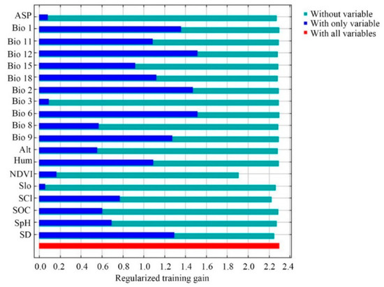 Jackknife test used to evaluate the relative importance of environmental variables for Euscaphis japonica in China by Maxent.