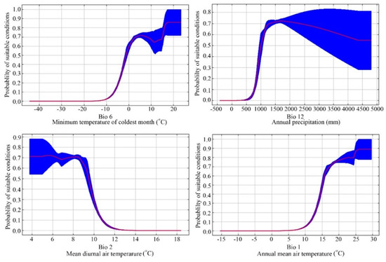 Jackknife tests (Figure 3) analyzed in Maxent on the environmental variables indicated that (Bio 6, Bio 12, Bio 2, and Bio 1 were the most important environmental factors affecting the distribution of E. japonica. Analyzing those response curves (Figure 4) also indicated how the logistic prediction for E. japonica changes while maintaining the remaining predicting factors at their average values. Generally, the minimum temperature of the coldest month and the annual mean temperature showed a positively non-linear response, but a negative nonlinear response for mean diurnal range. The optimum annual precipitation for the probability of E. japonica occurrence was approximately 1000–2000 mm.