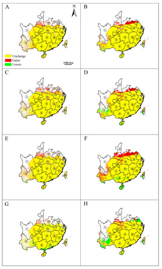 Changes in distribution area for Euscaphis japonica under climate change scenarios RCP2.6 and RCP8.5 by Maxent (A,C,E,G) and GARP (B,D,F,H). A, B, scenarios for RCP2.6-2050; C, D, scenarios for RCP2.6-2070; E, F, scenarios for RCP8.5-2050; G, H, scenarios for RCP8.5-2070. ① Sichuan; ② Yunnan; ③ Shanxi; ④ Chongqing; ⑤ Guizhou; ⑥ Guangxi; ⑦ Hainan; ⑧ Guangdong; ⑨ Hunan; ⑩ Hubei; ⑪ Henan; ⑫ Anhui; ⑬ Jiangxi; ⑭ Jiangsu; ⑮ Shanghai; ⑯ Zhejiang; ⑰ Fujian; ⑱ Taiwan. Only the provinces where E. japonica is predicted to occur are shown.