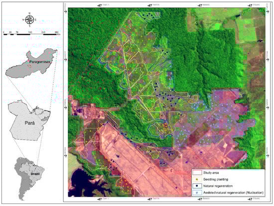 Forest loss and degradation spreads over 788,353 km2 in the Brazilian Amazon, of which 267,393 km2 (40%) are in the Pará state and 8792 km2 (1%) in the Paragominas municipality, where our study was conducted []. Mining has significantly contributed to such forest loss and degradation. To redress this situation, a range of restoration programs on deforested and degraded areas were created and implemented in the region [,,,,]. The restoration of post-mining areas in Brazil is under the regulation of federal Law 225 (1988 Federative Constitution of Brazil) and the specific laws of each state []; there is, however, insufficient regulation of restoration projects and companies often fail to restore forests adequately (e.g., many restoration projects use exotic species, Cruz et al. []). Some results of post-mining restoration in the region have been previously published [,]. For instance, since the late 1970s the Mineração Rio do Norte SA company has developed a forest restoration program in Oriximiná municipality (Pará State), planting native forest species []. Planting a rich suite of native forest species is desirable for several reasons, including biodiversity conservation [,] and preventing the establishment of exotic invasive species []. However, commercial timber species are often used due to their lower cost []. Restoration projects can be expensive and inefficient []; thus, there is an urgent need to implement adequate techniques for successful restoration projects [,].