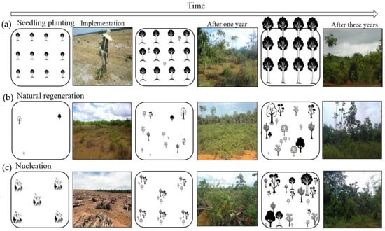 Sketch of the techniques that were used to restore forest vegetation in the studied post-mining sites and illustrative photos of the established vegetation over time. (a) Seedling planting, (b) natural regeneration, and (c) nucleation.