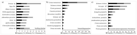 The species with highest IVI at seedling planting sites were Protium sp. (7.1% ± 0.16), Inga alba (Sw) Willd. (4.7% ± 0.07) and Khaya ivorensis A Chev. (4.6% ± 0.11) (Figure 3a); at natural regeneration sites they were Croton matourensis Aubl. (50.2% ± 0.19), Solanum crinitum Lam. (13.5% ± 0.1) and Vismia guianensis (Aubl.) Choisy. (10.2% ± 0.09) (Figure 3b); and at nucleation sites they were Solanum crinitum Lam. (25.7% ± 0.18), Cecropia sp.1 (21.4% ± 0.39) and Cecropia distachya Huber (19.1% ± 0.2) (Figure 3c). The families with highest IVI were Malpighiaceae, Euphorbiaceae and Urticaceae at each restoration type, respectively (Figure S1).