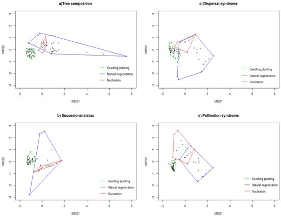 PERMANOVA showed that successional status, dispersal and pollination syndromes significantly differed among sites restored with different techniques (Table 2b–d). Again, seedling planting sites were clearly segregated from the two other sites and the natural regeneration sites were the most widely spread on the NMDS plot (Figure 4b–d).