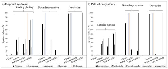 Proportion of species according to the (a) dispersal and (b) pollination syndromes in seedling planting, natural regeneration and nucleation sites.