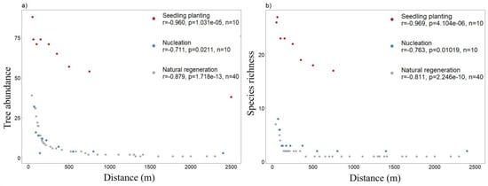 Tree abundance and species richness at the restored plots were negatively correlated with distance to the seed sources under the three restoration techniques (Figure 6). The seedling planting plots exhibited the highest correlation coefficients and the nucleation plots the lowest. Noticeably, abundance and species richness gradually declined with their distance to forest edge at the seedling planting sites. However, both nucleation and natural regeneration sites exhibited a sharp decline in the abundance and species richness along the shortest distances (<250 m) from seed sources; abundance and richness were very low and remained constant at distances > 250 m.