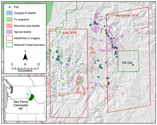 Study area showing WorldView-2 image extents, 2017–2018 insect and disease survey (IDS) polygons, and field plot locations on National Forest lands in central Idaho. The township surrounding Elk City is not National Forest land.