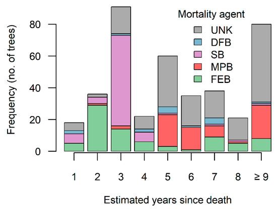 Estimated years since death and mortality agent for dead trees measured in field plots. UNK: Unknown or other; DFB: Douglas-fir beetle; SB: Spruce beetle; MPB: Mountain pine beetle; FEB: Fir engraver beetle.
