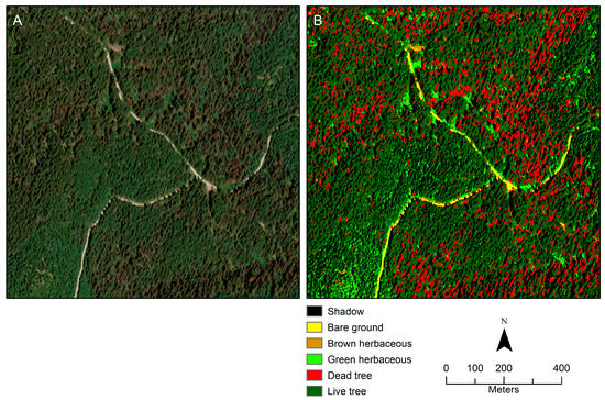 The imagery was classified into one of five classes: live trees, dead trees (red and gray), green herbaceous vegetation, brown herbaceous vegetation, and bare ground. Individual field-measured trees, live and dead, were related to individual WV2 pixels; these pixels were selected for image classification. Pixels of green herbaceous, brown herbaceous, and bare ground cover for classification were identified through visual inspection of imagery, as was done by Meddens et al. [15] and Bright et al. [16]. For each of these five classes, 50% of the identified pixels were reserved for classification training and 50% were reserved for classification evaluation. Maximum likelihood classification of imagery into the five previously mentioned classes was implemented in ERDAS IMAGINE software, using green, red edge, near-infrared 2, NDVI, and RGI indices/bands as classification variables. Shadows and water bodies were masked using the red band (red < 4.1% reflectance). A dead tree grid, where dead tree pixels were set to one and pixels in other classes were set to zero, was created from the classified imagery for further analysis. Our high classification accuracy (see Results) allowed us to use these satellite-based classifications as reference data for evaluating the IDS polygon data.
