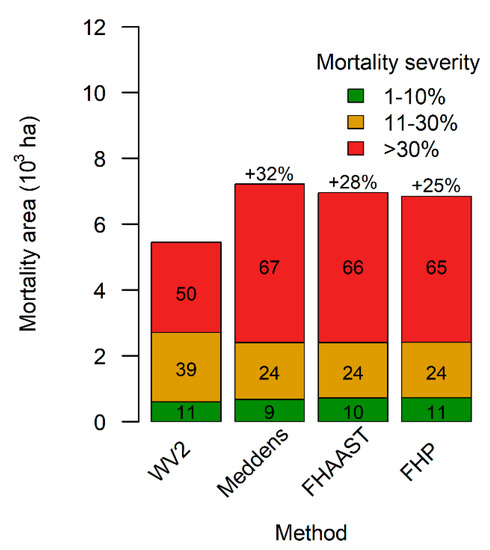 Within IDS polygon extents, the IDS estimates of total cumulative mortality area were 25–32% greater than that of WV2 (Figure 4). The FHP method estimate of total mortality was closest to that of WV2 and estimated 25% more mortality area than WV2. Total mortality areas estimated for low and moderate severity (<30%) were close between WV2 and each of the three methods, whereas the IDS methods estimated more total area of severe mortality within IDS polygon extents.