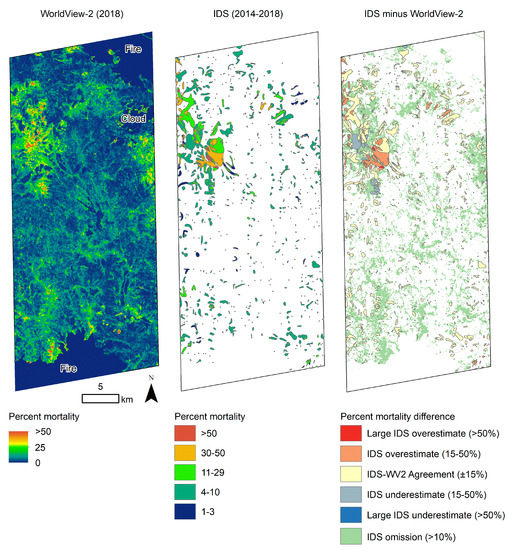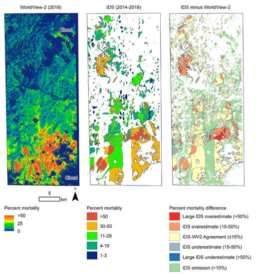 To compare IDS to the WV2 estimates of tree mortality, cumulative 2014–2018 percent-mortality measurements of IDS polygons as determined by each of the three methods were classified into three- (1–10%, 11–30%, and >30%) and five-class (1–3%, 4–10%, 11–29%, 30–50%, and >50%) percent-mortality estimates. We calculated percent mortality of the WV2 dead tree grid within each IDS cumulative mortality polygon, and likewise converted WV2 continuous measures of percent mortality to three- and five-class percent-mortality measurements. IDS and WV2 classified mortality estimates were then assessed via confusion matrices for each of the three methods [27], where the unit of analysis was a cumulative IDS polygon.