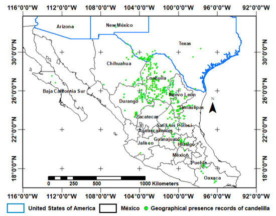 Presence sites of candelilla in North America, extracted from the Global Biodiversity Information Facility (GBIF).
