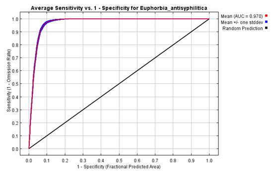 Jackknife analysis was performed to determine the variables that reduce the model reliability when omitted [53]. We also used the area under the receiving operator curve (ROC–AUC) to evaluate the model performance. The ROC–AUC ranges from 0 to 1, where values near 1 indicate a good performance of the model and a value of 0.50 indicates the model does not perform better than random [47,54]. Meanwhile, a value of 1.0 indicates perfect discrimination [47,54,55]. The model with the highest UAC value was considered the best for assessing the potential distribution of Candelilla [52].