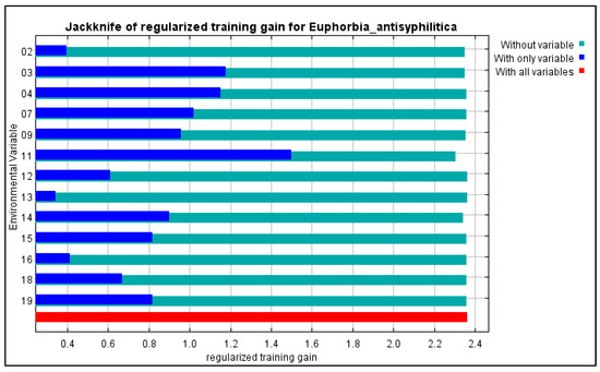 The Jackknife analysis showed that the mean temperature of coldest quarter has the highest relative importance as independent variable over the candelilla distribution model. In addition, it indicated that the environmental variables related to temperature (isothermality (BIO2/BIO7) (×100) and temperature seasonality (standard deviation ×100) are important for the candelilla’s distribution model (Figure 3).