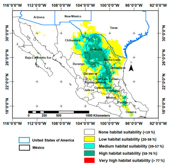 The estimated area for the medium and low habitat suitability classes predicted a large area of potential distribution of candelilla in North America. This area included the states of Tamaulipas, Jalisco, western Zacatecas and western Guanajuato in Mexico, as well as southeastern Texas in the USA. Currently there is no evidence of presence of candelilla in this area [9,27,31,58]. Therefore, the current projection of candelilla’s distribution seems to match better with the high habitat suitability class (19,166,820 ha), which includes the states of Coahuila, northeast Durango, Easter Zacatecas and San Luis Potosi in Mexico and a small area in the south of Texas (Figure 2 and Figure 4) [9,31].
