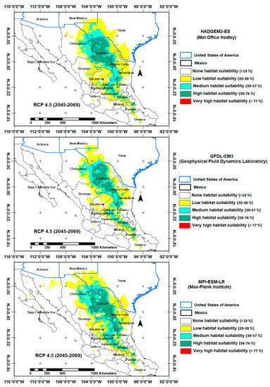 According to the projection obtained with the GCMs and the RCP4.5, the increase in the area caused by climate change in the future (Year 2069) for the none, low and medium classes would occupy lands beyond the north and west portion of the current distribution, mainly in the states of Chihuahua and Sonora in Mexico and Texas in the USA. This behavior could be related to the warming that will probably occur in lower latitudes as a consequence of climate change. The distribution of candelilla seems to be higher in colder areas (Figure 5). For the high habitat suitability class, the GFDL-CM3, HADGEM2 and MPI-ESM-LR models predicted a reduction of 39.2, 20.8 and 10.7 in the candelilla’s distribution area, respectively. The states where candelilla populations could be negatively affected are Coahuila and San Luis Potosí in Mexico. Currently, the largest harvest of the species is carried out in these states [8,9].
