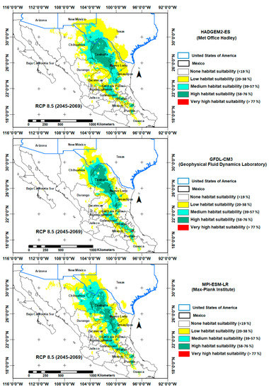 The present research has the main objective of modeling the current and future potential distribution of candelilla (Euphorbia antisyphilitica Zucc.) in North America, based on two RCPs and employing three GCMs [41,42]. These SDMs would be useful to assist in the conservation of vulnerable wild populations or in the cultivation the species in areas where a greater adaptability of the species to climate change may be achieved [32,34].