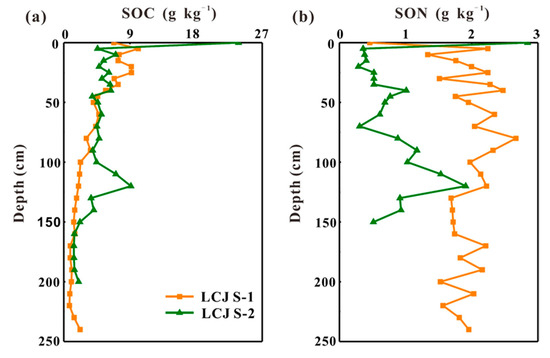 Vertical distribution of SOC (a) and SON (b) in soil profiles. (SON contents of soil samples below 150 cm in soil profile LCJ S-2 were lower than the instrument detection limit).