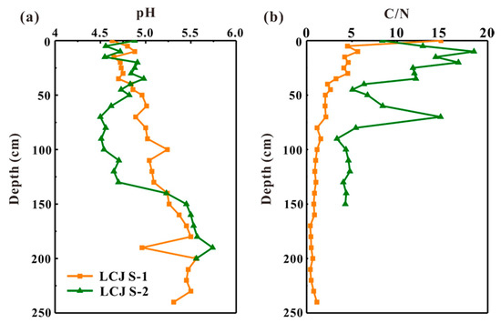 It has been widely reported that the materials with lower C/N ratio would be decomposed into the more mobile materials or nutrients that were easy to be utilized by plants or microorganisms [5,43]. Therefore, soil C/N ratio was an important parameter used to roughly evaluate the decomposition rates of soil organic matter [4]. Soil profiles LCJ S-1 and LCJ S-2 were covered by C3 plants and Goosegrass, whose C/N ratios were 21.52 and 30.07, respectively. The soil C/N ratios ranged from 0.40 to 14.84 in LCJ S-1, 3.36 to 16.78 in LCJ S-2 (Table 2), which were obviously lower than those of the surface plants. As shown in Figure 3, the C/N ratio in both soil profiles gradually decreased as soil depth increased, indicating that SOM in deep soils was more easily to be decomposed and utilized. The distribution tendency of soil pH values and soil C/N ratios in the two soil profiles was the opposite, which indicated a potential relationship between them in the two soil profiles.